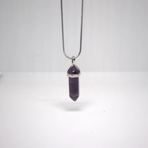 Naszyjnik z ametystu w kształcie grotu zawieszony jest na delikatnym łańcuszku o grubości 1 mm i długości 60 cm. Całość wykonana jest ze stali nierdzewnej, dzięki czemu pasuje do codziennego noszenia. Ten model dobrze wygląda w minimalistycznych stylizacjach. Jest też dyskretnym akcentem przy bardziej eleganckich zestawach.