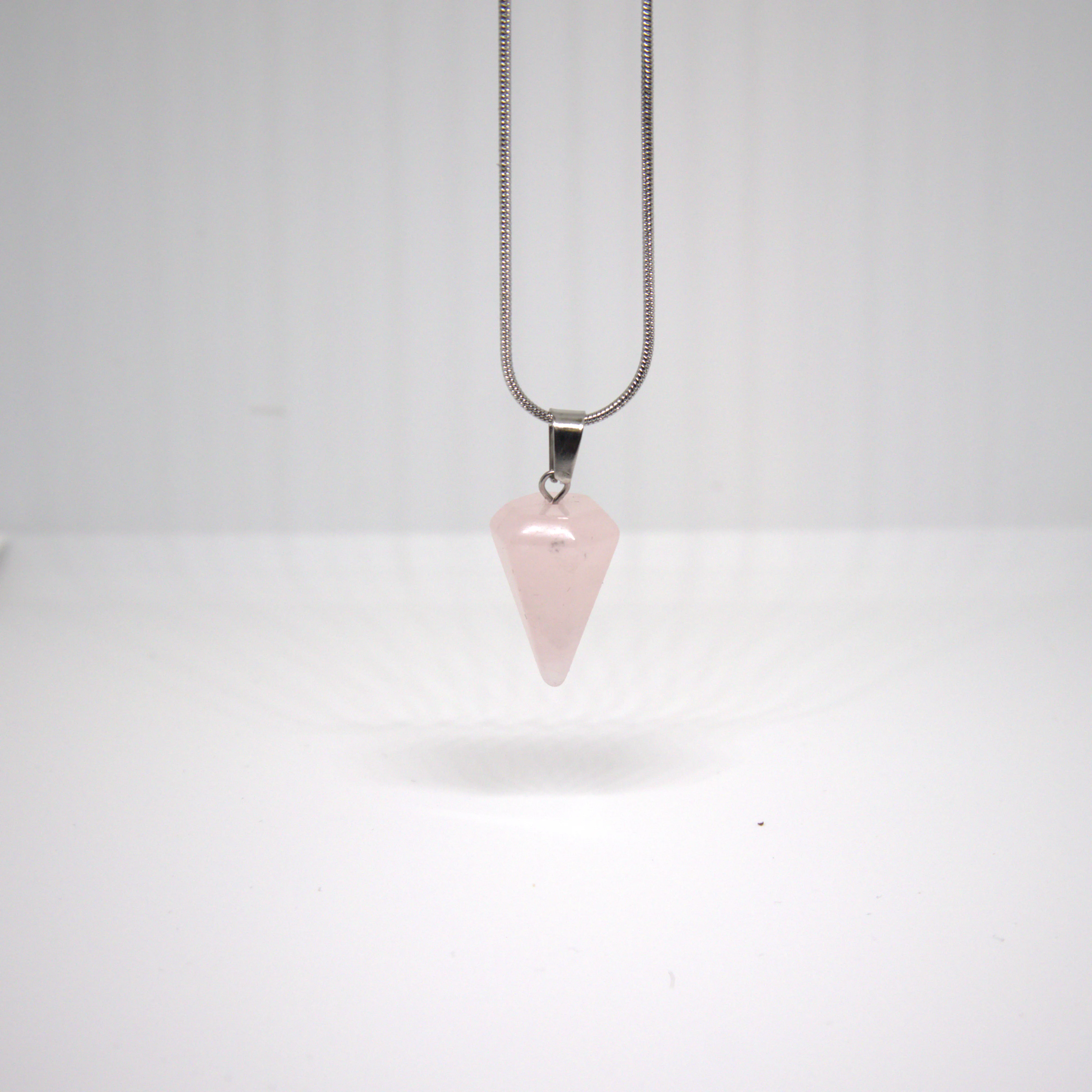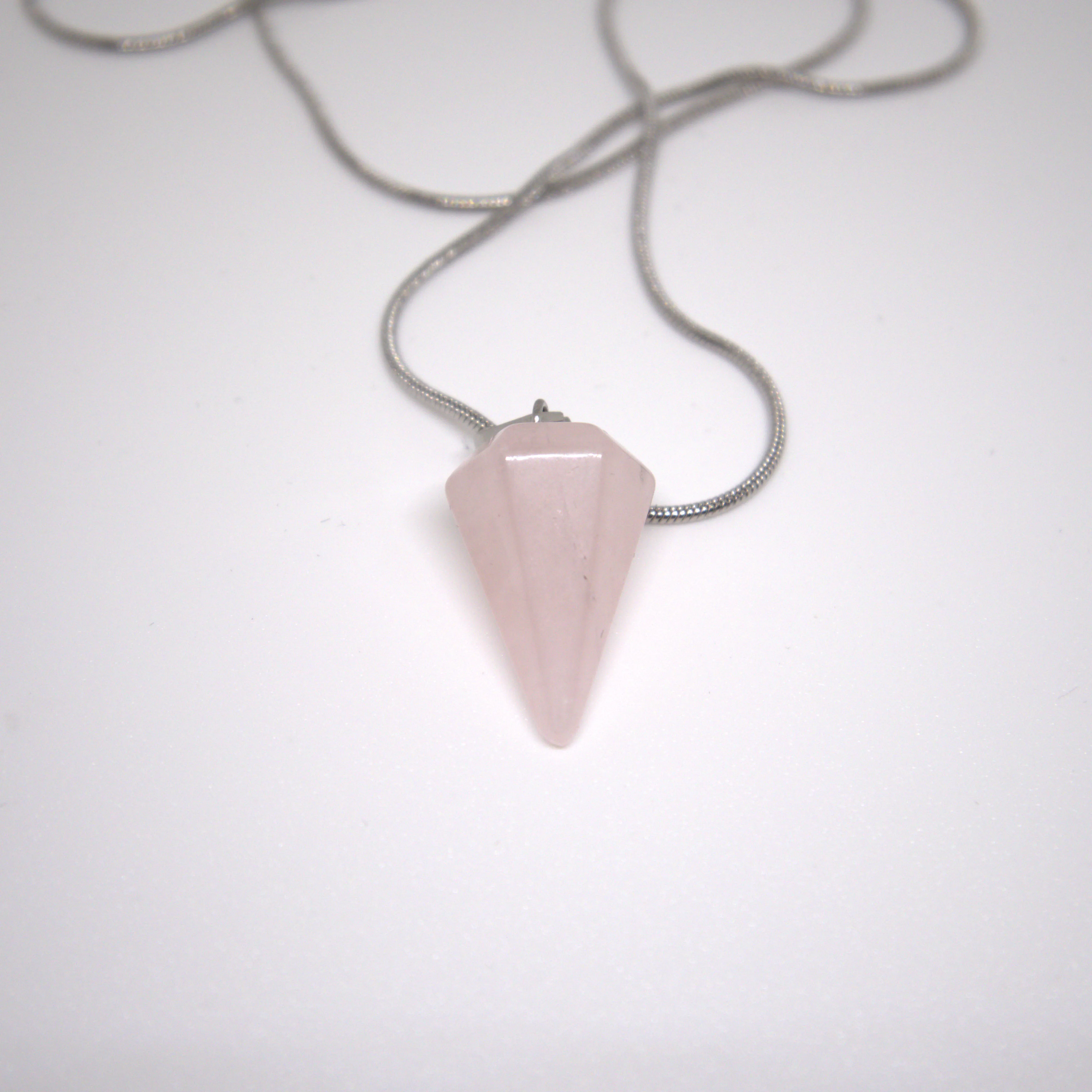 Naszyjnik z kwarcu różowego w formie grotu na delikatnym łańcuszku 1 mm o długości 60 cm. Stal nierdzewna. Subtelny amulet miłości, który wspiera czułość, harmonię w relacjach i miłość do siebie.
