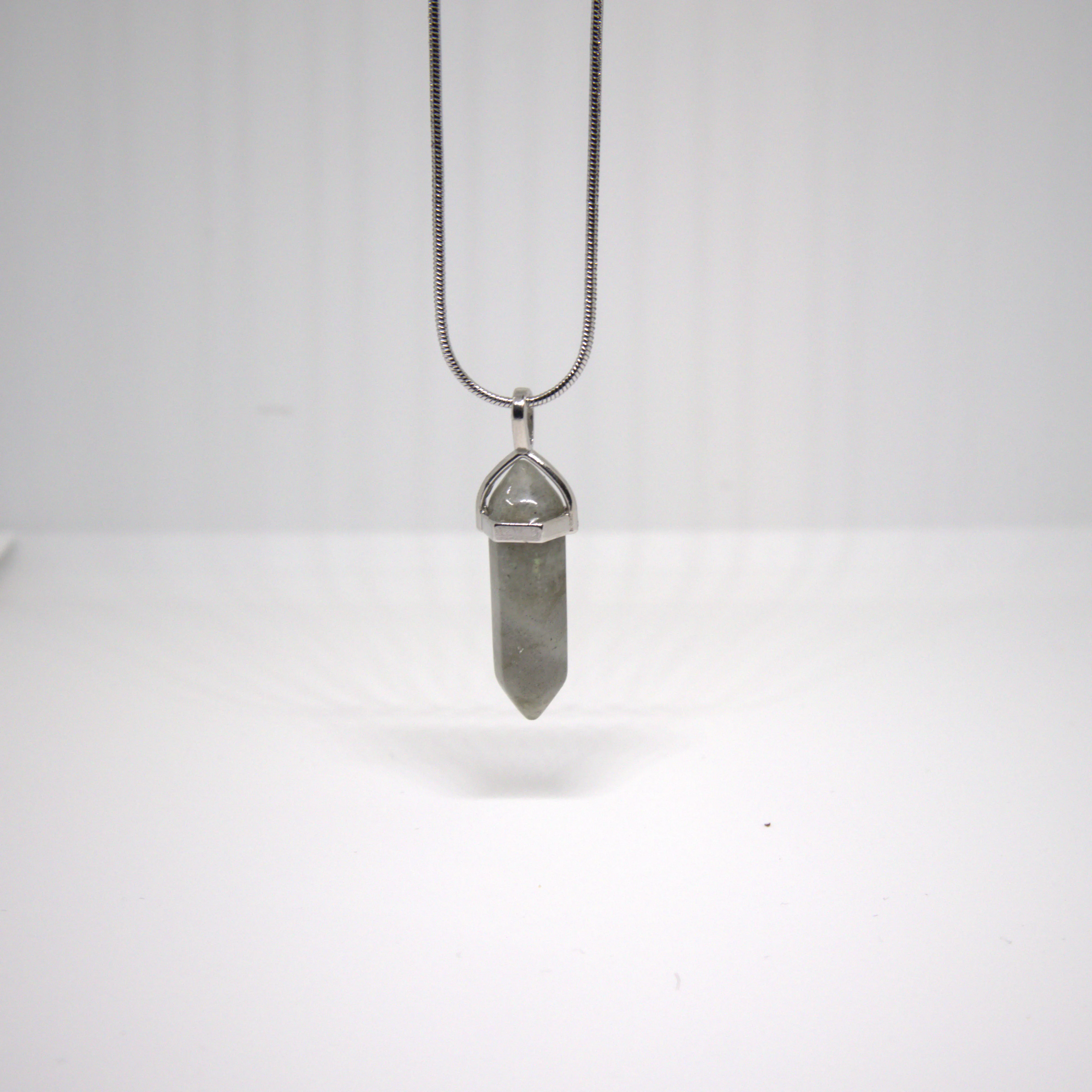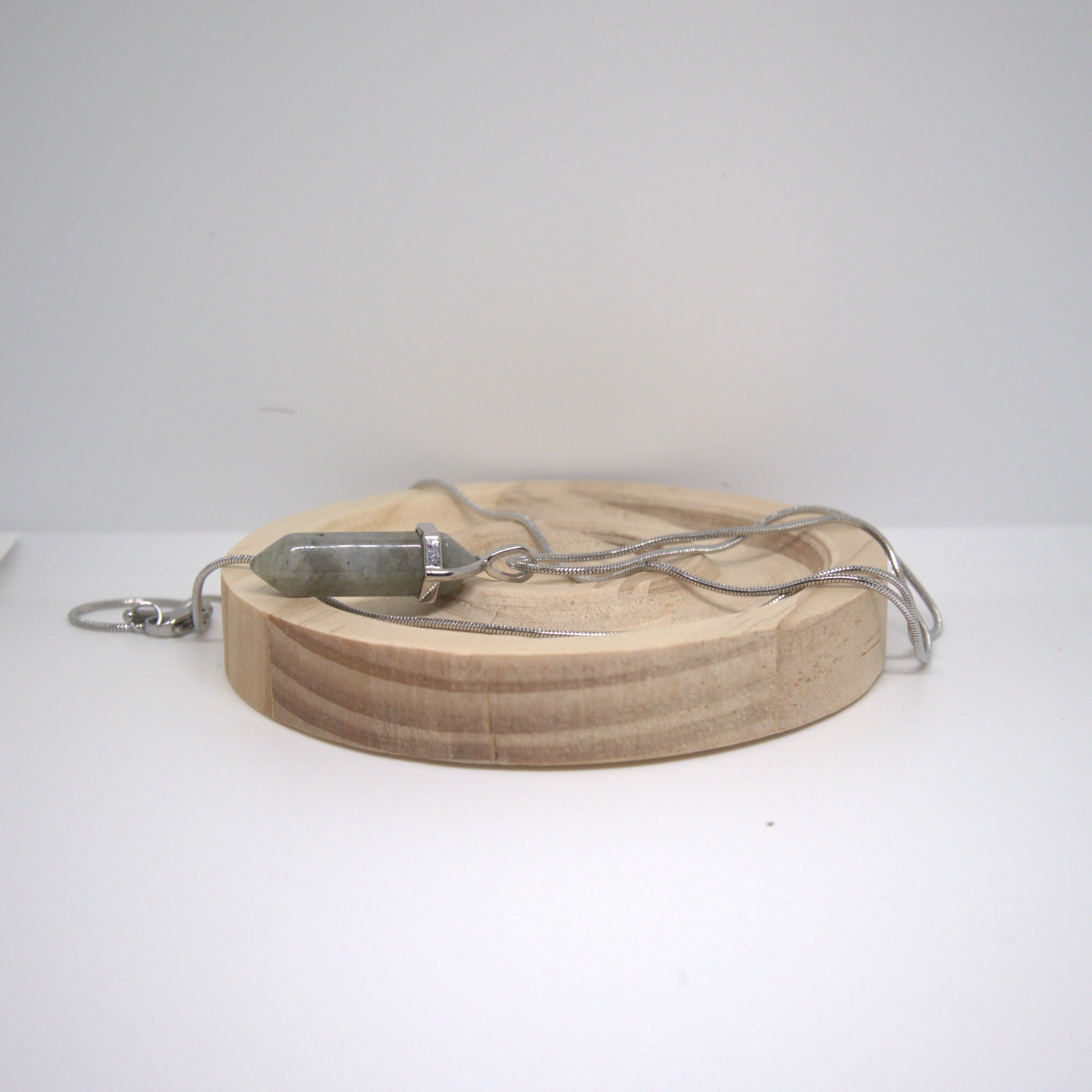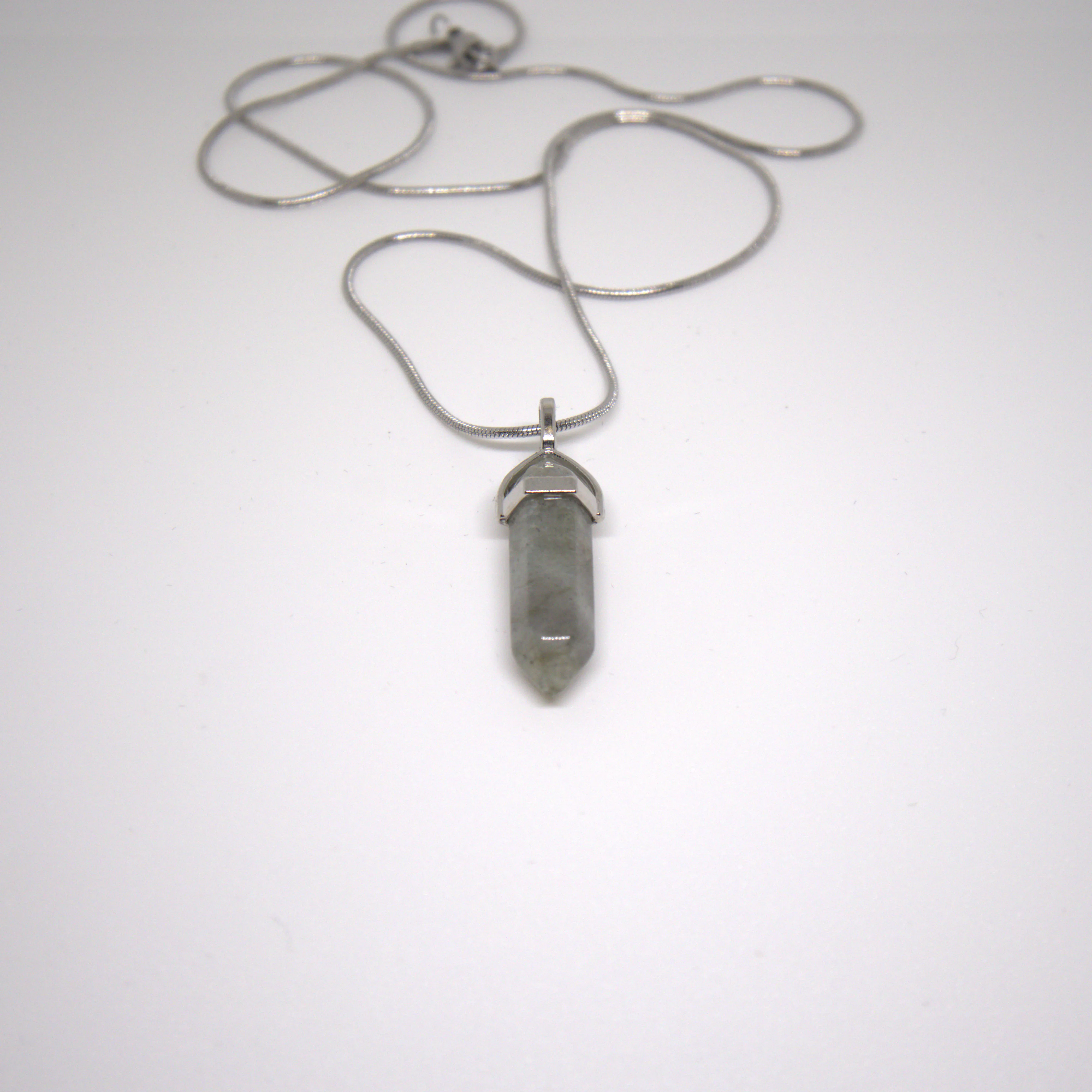 Naszyjnik z labradorytu w formie grotu na delikatnym łańcuszku 1 mm o długości 60 cm. Stal nierdzewna. Minimalistyczny amulet intuicji, który wspiera ochronę energetyczną, wewnętrzny spokój i lepszy kontakt z własnym wyczuciem.